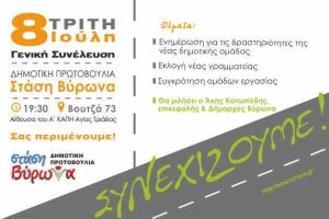 Ύστερα από την τελευταία μεγάλη εκλογική επιτυχία, όπου οι Βυρωνιώτες/σες ανέδειξαν την Δημοτική Πρωτοβουλία «Στάση Βύρωνα» νέα δημοτική αρχή, η παράταξη συγκροτείται με πρώτο σταθμό την Τρίτη 8 Ιούλη στην αίθουσα του ΚΑΠΗ Αγ. Τριάδας (Βουτσά 73), στις 19:30 με την Γενική Συνέλευση όπου:
