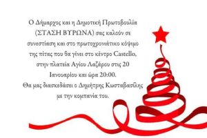 Ο Δήμαρχος Βύρωνα και επικεφαλής της Δημοτικής Πρωτοβουλίας "Στάση Βύρωνα" σας καλούν στην κοπή της πίτας και στο λαϊκό γλέντι, την Παρασκευή 20 Ιανουαρίου 2017, στις 20:00, στο κέντρο Castello, (πλατεία Αγ. Λαζάρου). Θα μας διασκεδάσει το συγκρότημα του Δημήτρη Κωσταβασίλη.