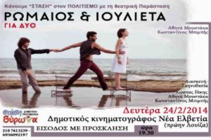 Μια πολύ ωραία και πρωτότυπη παράσταση είχαν την ευκαιρία να δουν όσοι παρευρέθηκαν στην θεατρική παράσταση "Ρωμαίος και Ιουλιέτα για δύο" που διοργάνωσε η "Στάση Βύρωνα" την Δευτέρα 24 Φεβρουαρίου στον δημοτικό κινηματογράφο "Νέα Ελβετία".