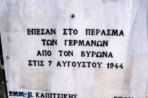 Η αρχική μαρμάρινη πινακίδα, που τοποθετήθηκε στο χώρο της εκτέλεσης έγραφε τα εξής: "ΕΠΕΣΑΝ ΣΤΟ ΠΕΡΑΣΜΑ ΤΩΝ ΟΥΝΩΝ ΑΠΟ ΤΟ ΒΥΡΩΝΑ στις 7 ΑΥΓΟΥΣΤΟΥ 1944". Πρόσφατα η πινακίδα αυτή υπέστη σημαντικές φθορές. Η καινούργια που τοποθετήθηκε αντί του "έπεσαν στο πέρασμα των Ούνων" αναγράφει "ΕΠΕΣΑΝ ΣΤΟ ΠΕΡΑΣΜΑ ΤΩΝ ΓΕΡΜΑΝΩΝ". Θα ’ταν πιο σωστό βέβαια να γράφει: "Έπεσαν στο πέρασμα του φασισμού".